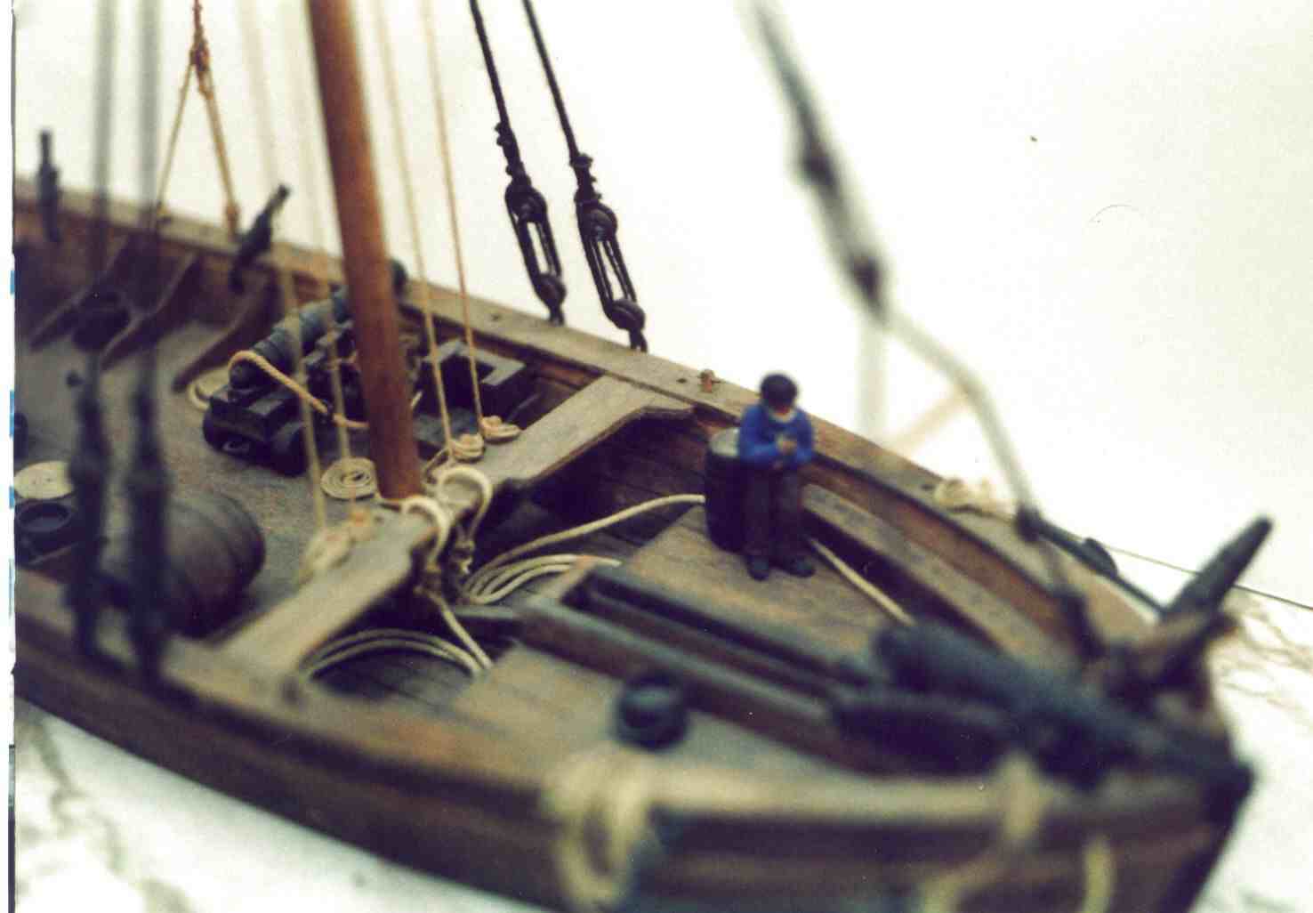 Closeup, showing the out-of-focus bow cannon and rigging.