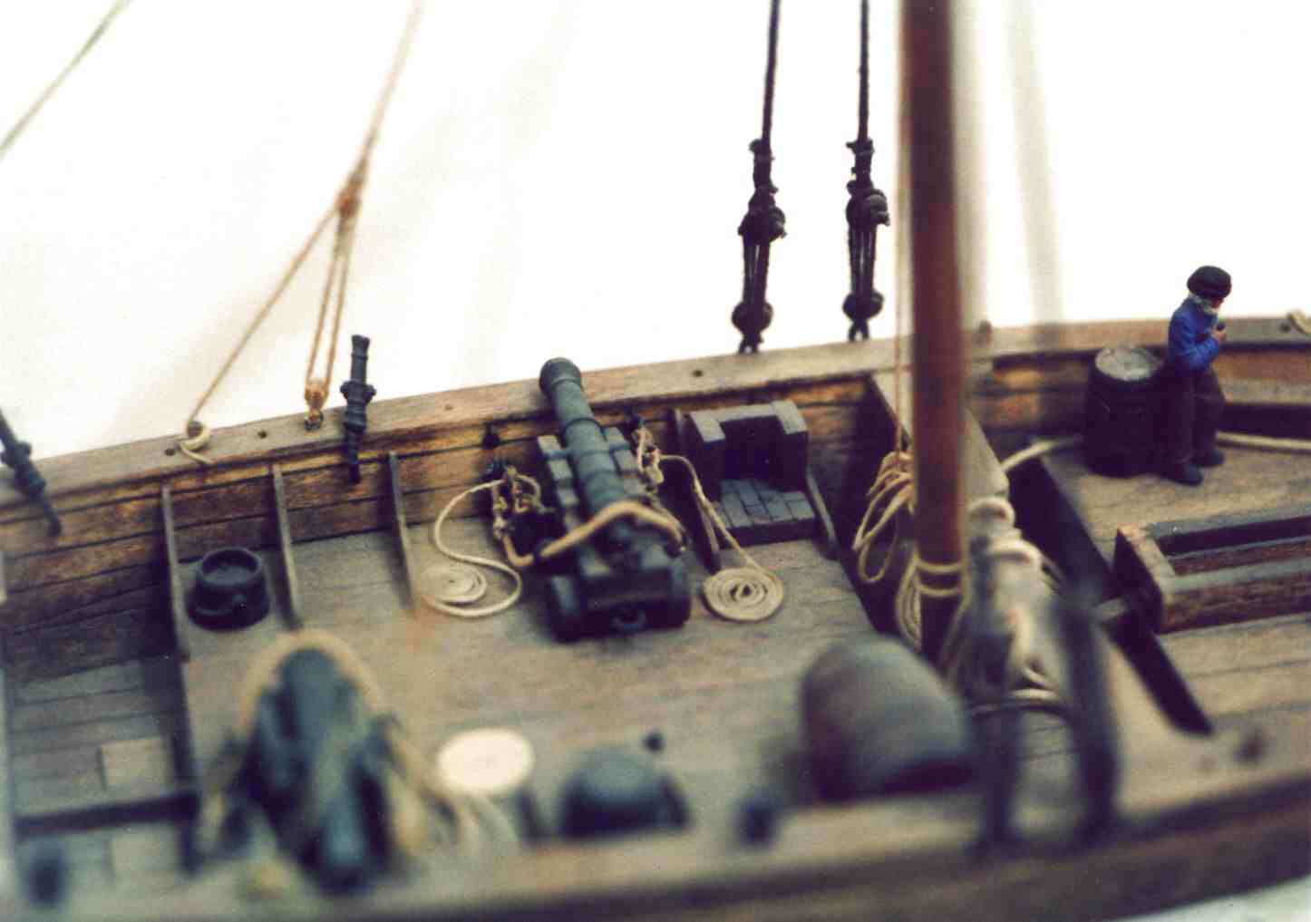 Closeup showing amidships cannon and fireplace. How cozy! Barrels and buckets were also purchased.